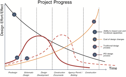 Adelantar la toma de decisiones constituyendo el equipo al inicio, contribuye a una mayor eficacia del proceso. Existen muchos estudios que así lo atestiguan como los de Patrick Mac Leamy para HOK (Hellmuth Obat y Kassabaum, uno de los estudios de arquitectura más importantes del mundo) presentado en el American Institute of Architects o AIA (Instituto Americano de Arquitectos): “Cuánto antes se tome una decisión sobre el proyecto será más barato y eficaz”.